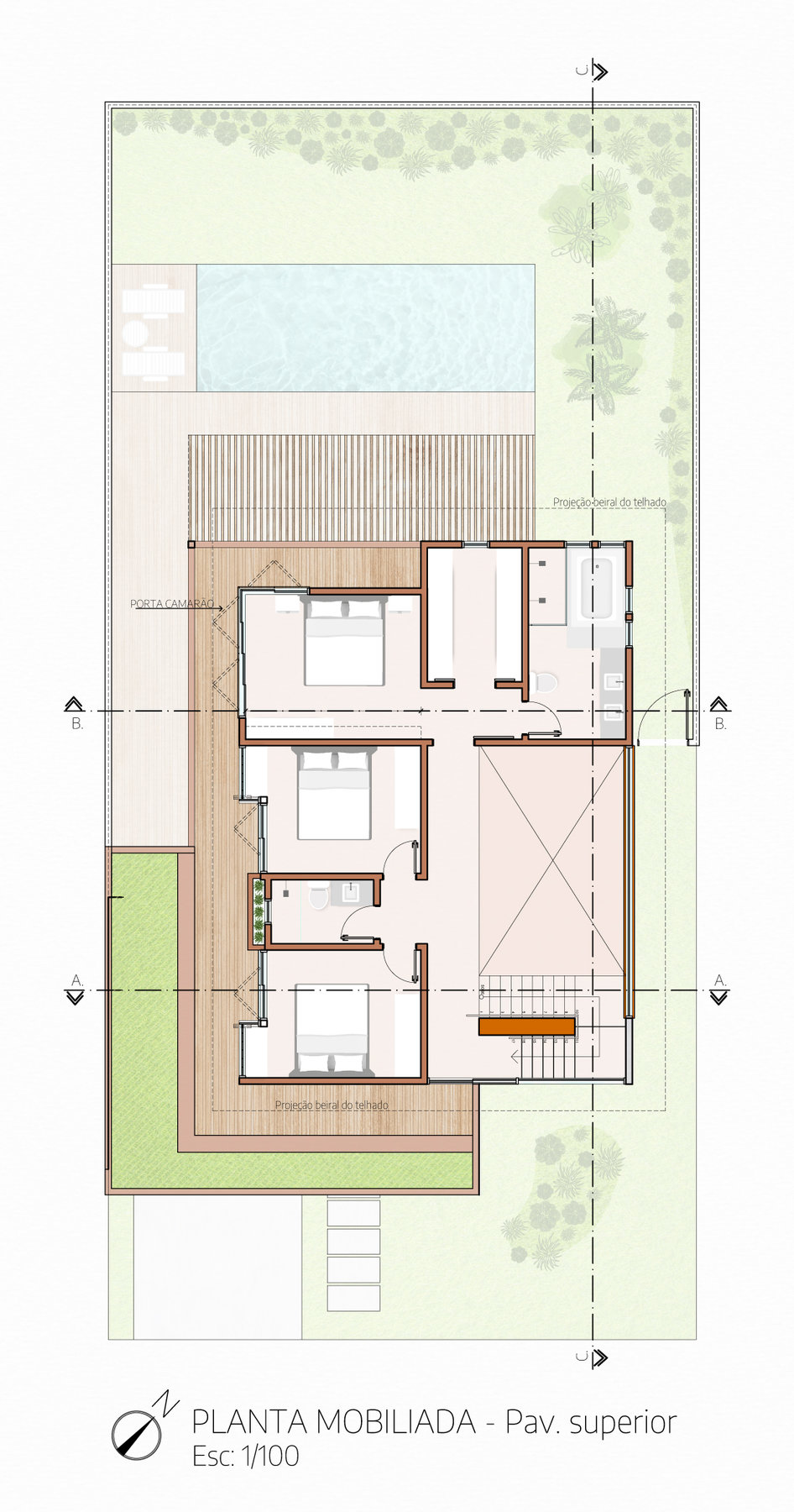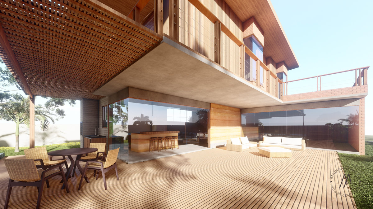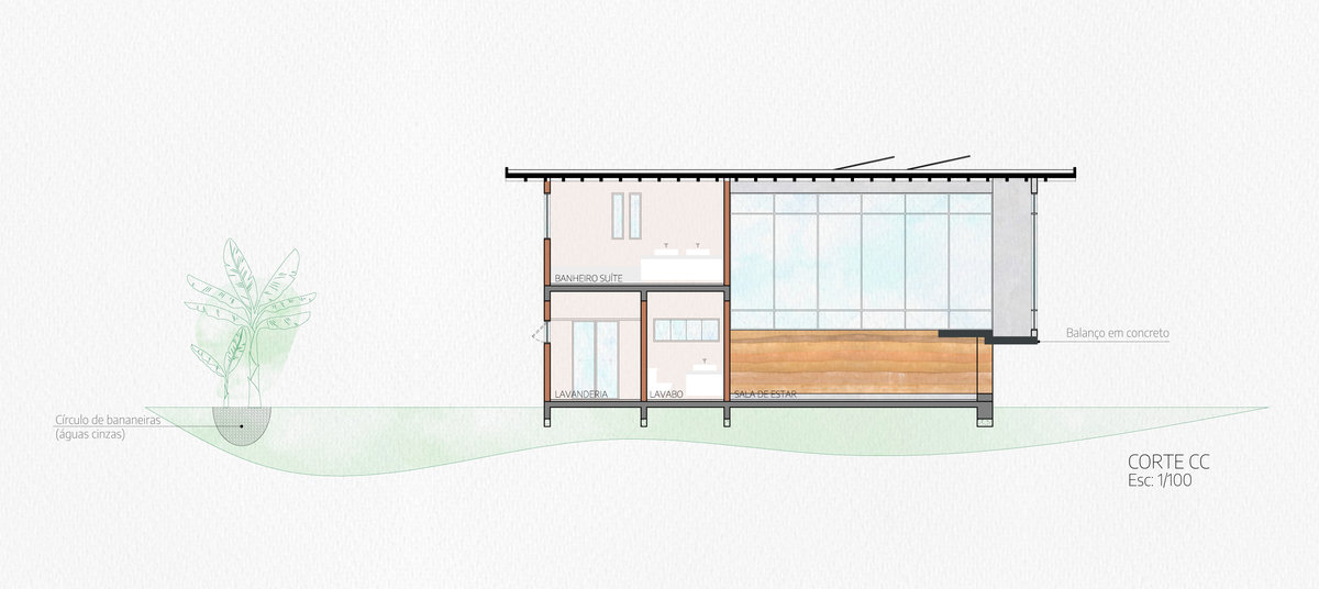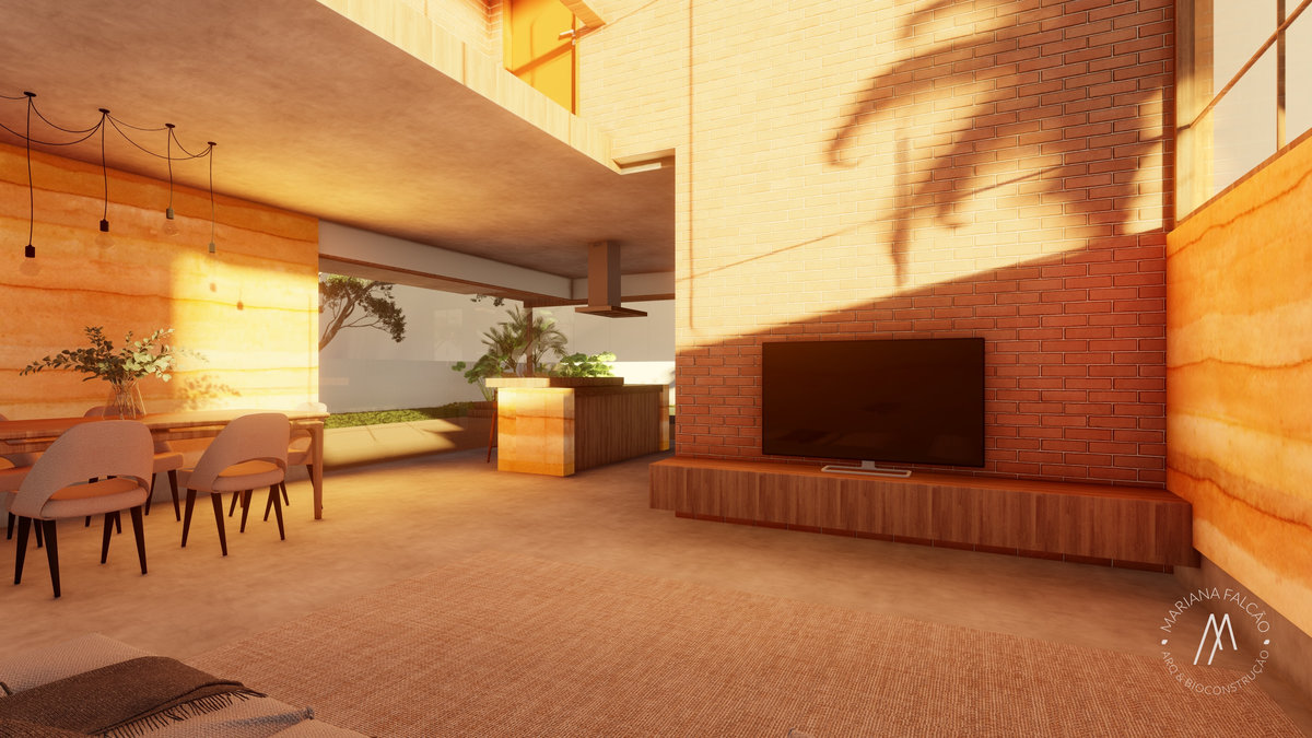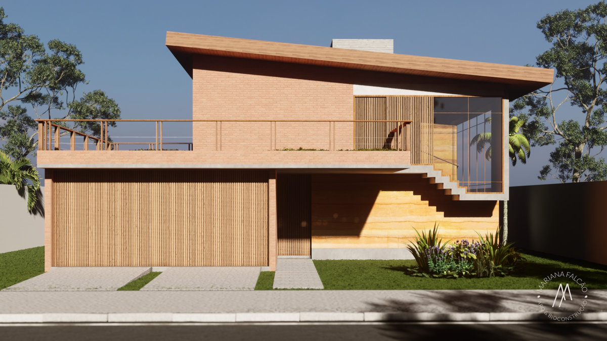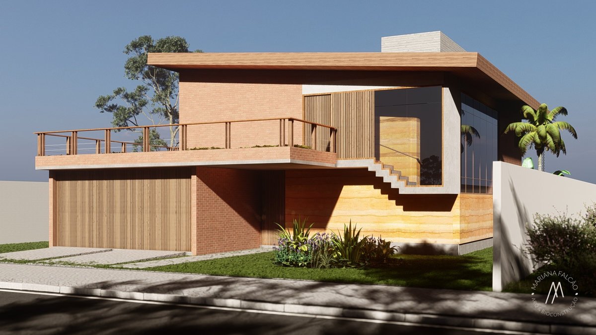 Com uma paleta de materiais que valoriza a terra, a madeira e o concreto, a residência equilibra modernidade e aconchego. O terraço-jardim contribui para o conforto térmico e reforça a integração com a natureza.
